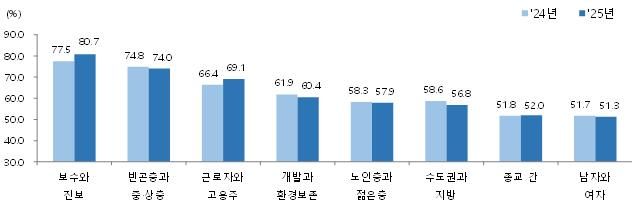 지난해 우리 국민들이 가장 심각하다고 느낀 사회 갈등은 '보수와 진보'(77.5→80.7%)였다. 빈곤층과 중산층(74.8→74.0%), 근로자와 고용주(66.4→69.1%), 개발과 환경보존(61.9→60.4%), 노인과 젊은층(58.3→57.9%), 수도권과 지방(58.6→56.8%), 종교(51.8→52.0%), 남자와 여자(51.7→51.3%) 등이 그 뒤를 이었다.