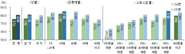 월 소득 600만원 이상(79.9→84.2%)과 500만~600만원(77.3→85.5%), 400만~500만원(73.9→81.3%), 300만~400만원(76.9→80.9%) 구간에서는 삶에 만족하는 응답 비율이 80%를 넘었고 상승폭도 상대적으로 컸다.
