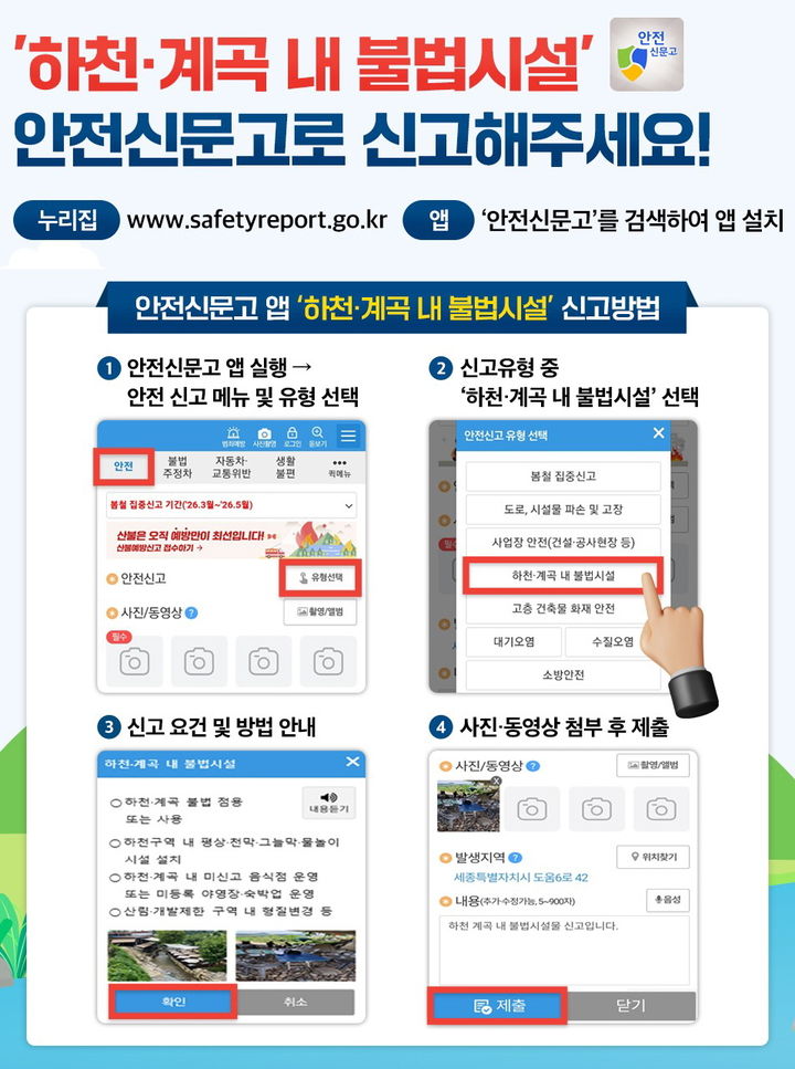 신고를 원하는 시민은 '안전신문고' 웹과 모바일 앱의 '안전신고' 메뉴에서 '하천·계곡 내 불법시설' 유형을 선택해 참여할 수 있다.