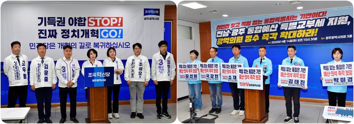 조국혁신당 광주 출마자들은 전날 시의회 기자회견을 통해 "정치개혁은 흥정 대상이 아니고 두 번의 탄핵을 거치며 또 다른 '정치 괴물'을 막기 위해 광장의 시민들이 명령한 사회 개혁임에도, 민주당은 개혁진보 4당과 시민사회를 배제한 채, 내란 정당을 파트너로 삼아 개혁을 표류시키고 있다"고 직격했다.